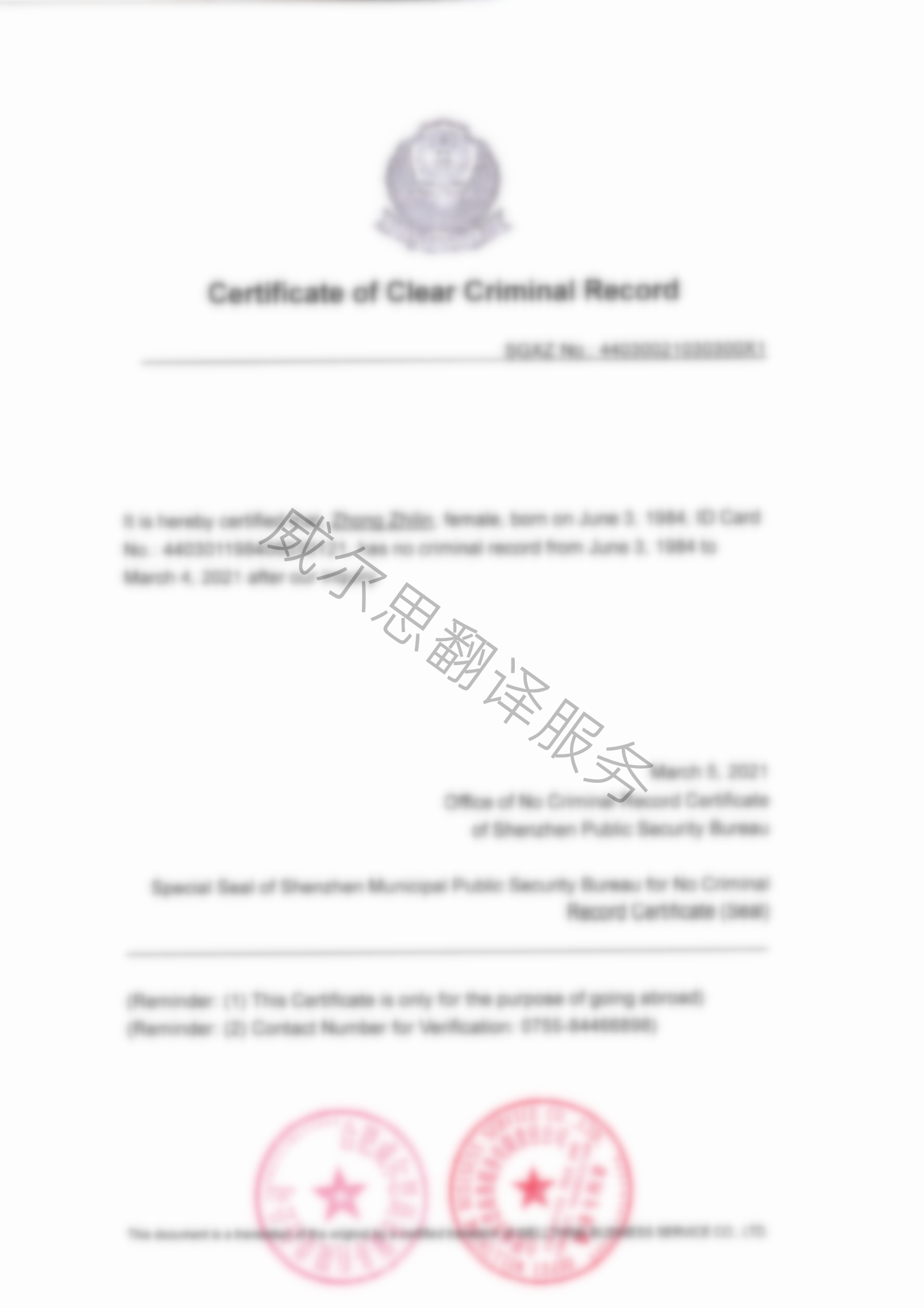 我們公司有多年的翻譯無犯罪記錄證明的經(jīng)驗,得到多個國家的移民局、政府機構、院校的認可,從未因為翻譯件質(zhì)量問題被拒。